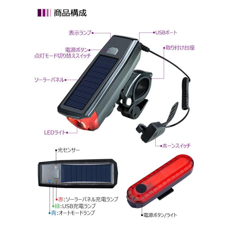 自転車 LEDライト ソーラー USB充電式 IPX4 防水 小型 軽量 4点灯モード 自転車用ベル付き